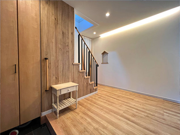 広々とした玄関は落ち着いた色味の木目調で統一しました。 階段の手すりはアイアン製で、魅力的なアクセントとなっています。