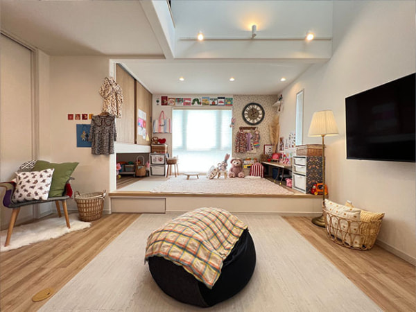 畳スペースには奥様のお気に入りが詰まっています。 お子様がまだ小さいのでソファはあえて置かずに、 自由に動き回れる広々としたリビングです。