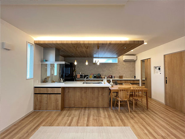 折り下げ天井に施工した木目調のアクセントクロスと、 天井を照らす間接照明の組み合わせで、 上品で温かみのある雰囲気に仕上がりました。