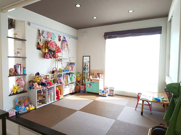 天井のクロスと畳、シェードをブラウンでまとめた、落ち着いた雰囲気の畳スペースです。建具を付けず、飾り棚はリビングと繋がっているので、開放的です。